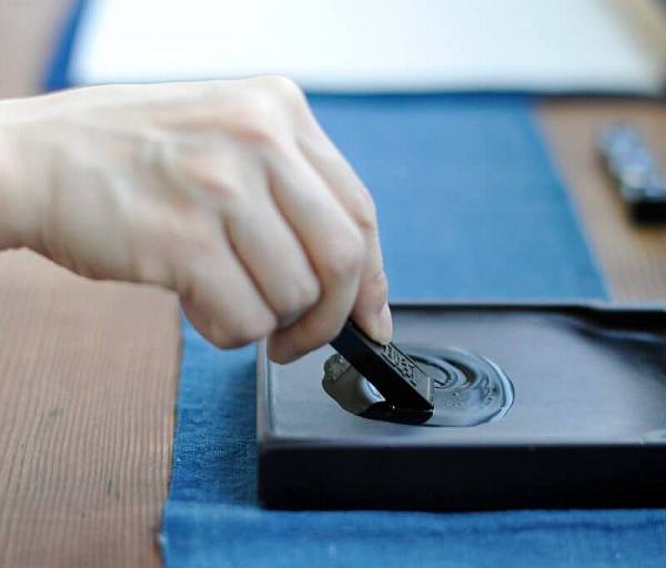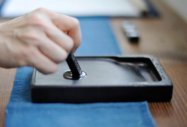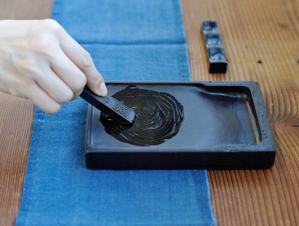 Um die wahre Farbe der Tusche hervorzubringen, gilt es als besonders wichtig, frisches Wasser zu verwenden und die Tusche nur mit ihrem eigenen Gewicht langsam und mit schwacher Kraft auf dem Reibstein zu reiben.