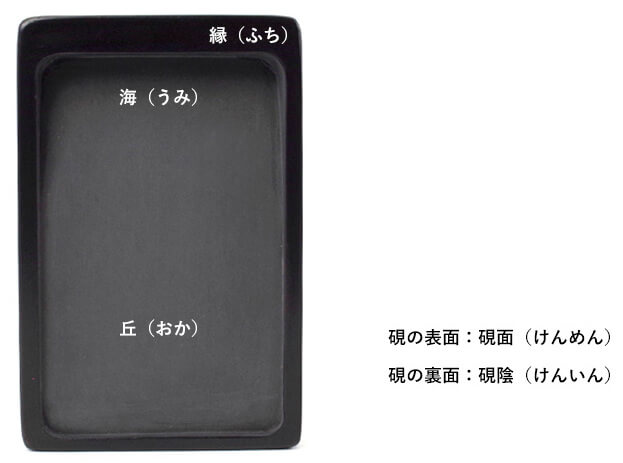 | 硯面 | Reibfläche | Der flache Teil des Steins, auf dem die Stangentusche mit Wasser verrieben wird. |