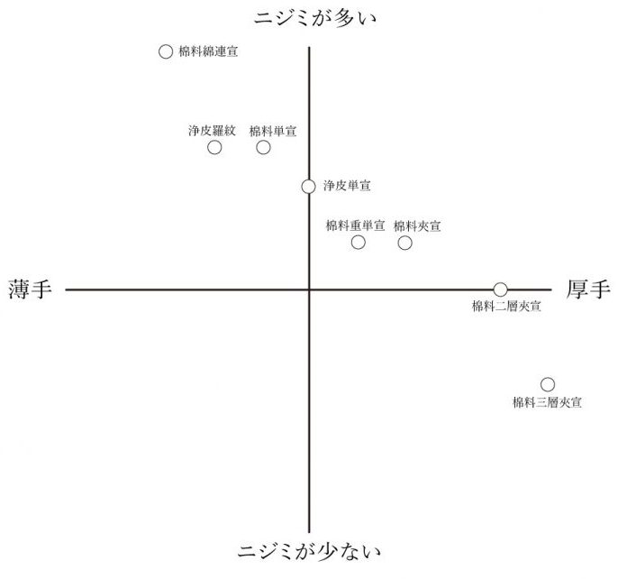 Xuan-Papier wird anhand seiner Materialzusammensetzung und Herstellungsweise in folgende Typen eingeteilt. Je nach Materialzusammensetzung und Herstellungsart unterscheiden sich diese Papiere deutlich. Zum Beispiel in ihrer Dicke oder der Neigung zur Tintenverläufen (Nijimi).