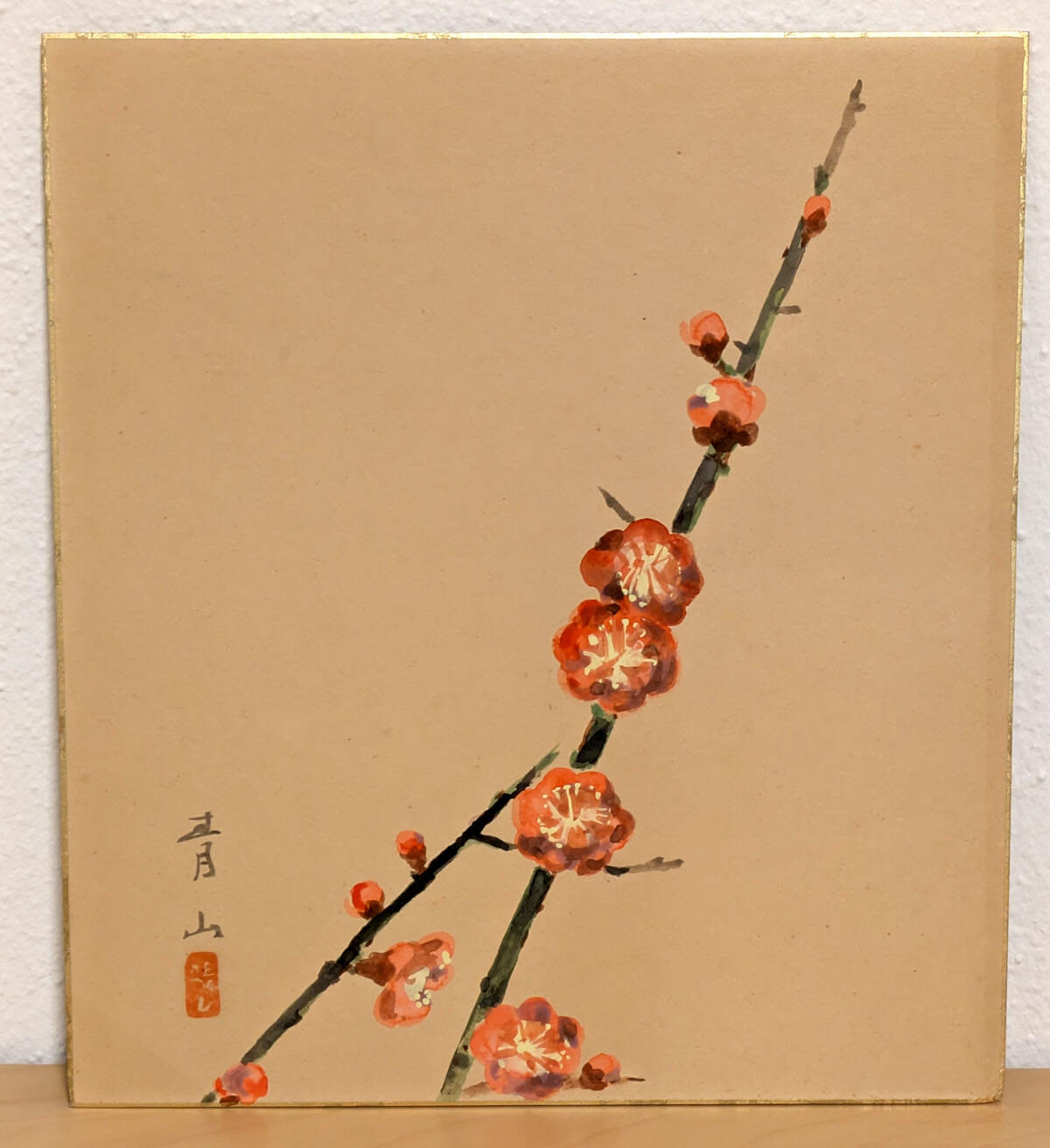 Das Motiv der Malerei ist ein Pflaumenblütenzweig 梅花 mit roten Blüten in verschiedenen Stadien (Knopsen, halb offen, voll erblüht); Dunkle, dynamische Äste in Sumi-e-Technik; Minimalistisch, asymmetrisch, viel leerer Raum → klassisches Zen-Design.