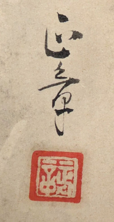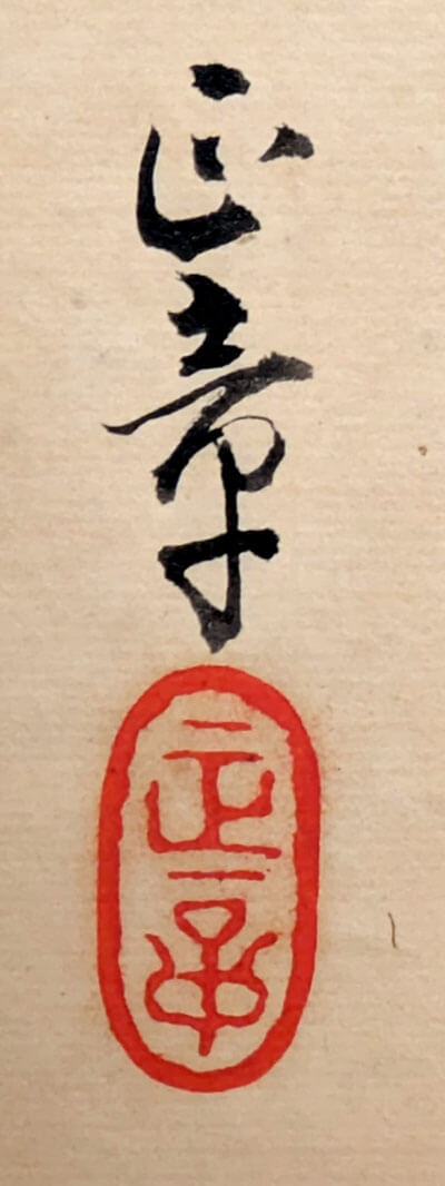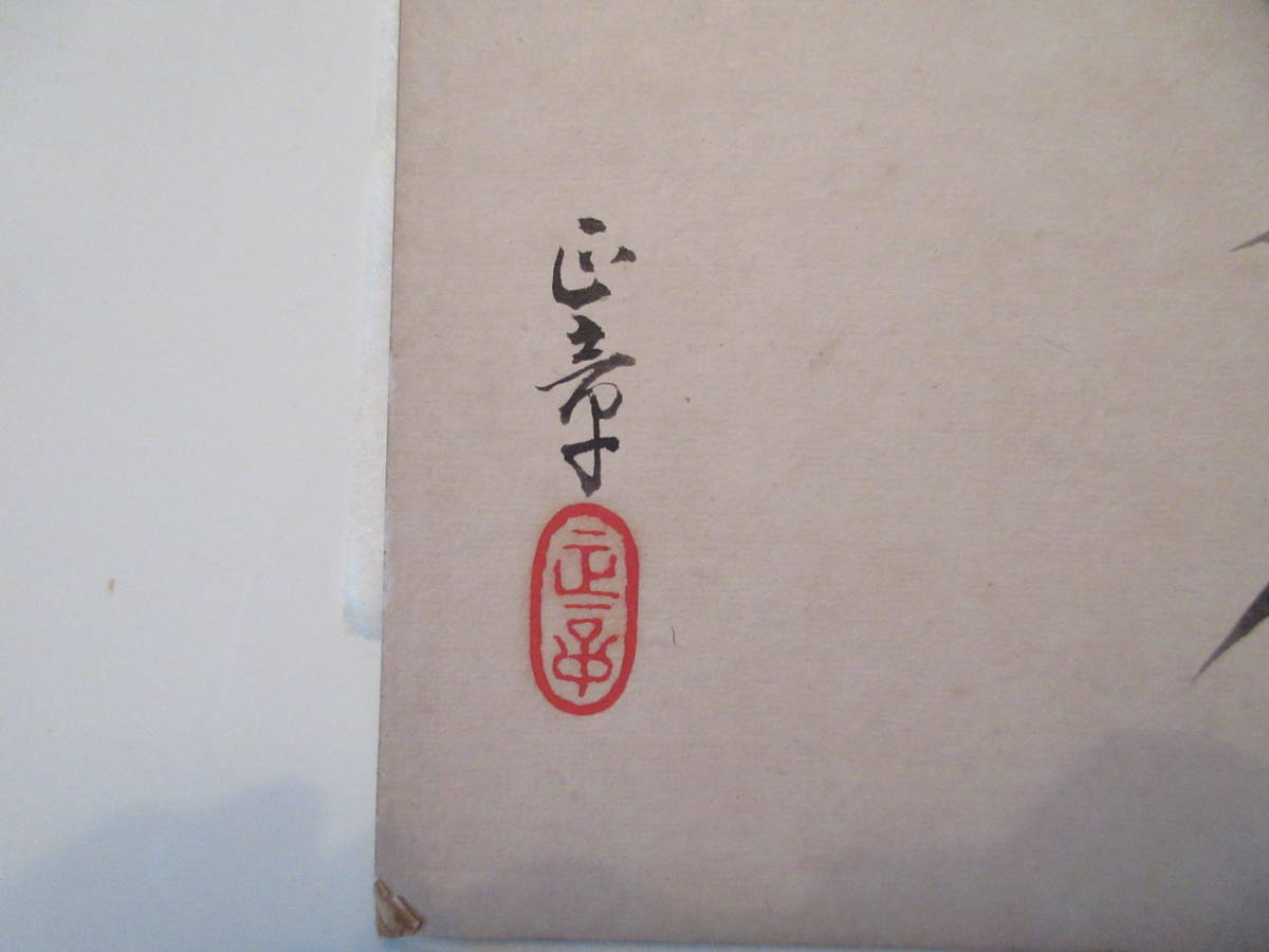 Auf dem Vogelgemälde ist die Signatur 正章 über dem roten Hanko-Stempel mit derselben Inschrift in »tensho« zu sehen.