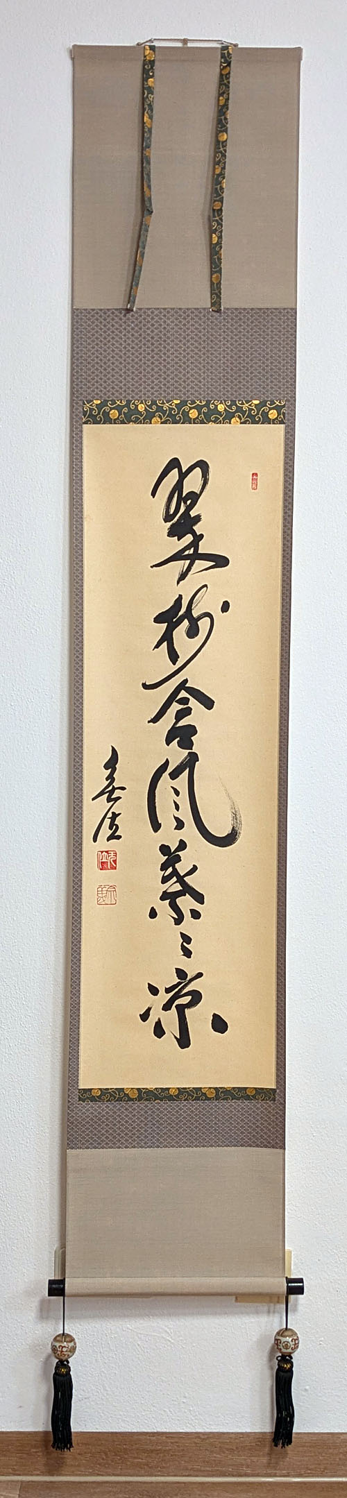 Dieser Spruch ist ein klassisches Zen-Gedicht (Zenka), das in der japanischen Chan- und Teekultur (Chado) häufig vorkommt, insbesondere in Kalligraphien für Teezeremonien (Chaka). Es beschreibt poetisch eine Szene der natürlichen Erfrischung: Frischer Wind, der von irgendwoher durch leuchtend smaragdgrüne Bäume („suijū“ – smaragdgrüne Bäume) weht, die Blätter („yōyō“ – Blatt für Blatt) rascheln lässt und eine kühle Brise („ryō“ – kühl) verbreitet. Die Lesung lautet etwa: „Suijū kaze o fukunde, yōyō suzushi“ – „Die grünen Bäume bergen den Wind, Blatt um Blatt erfrischend kühl“.