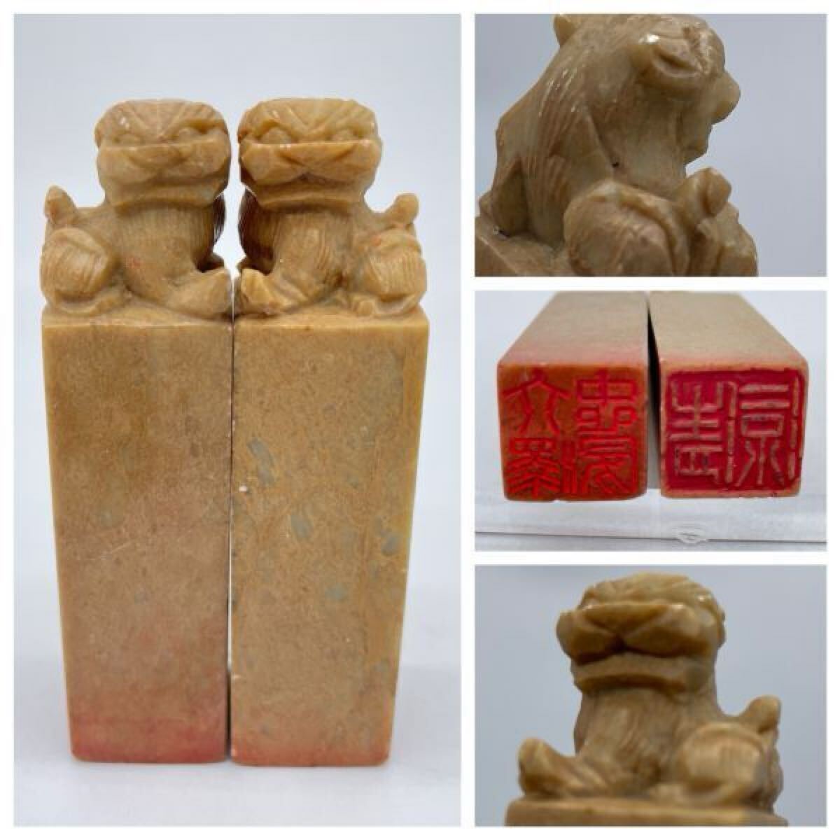 Paar geschnitzte, chinesische Siegel mit Löwen aus Shoushan-Stein, 7 cm hoch, geeignet für Siegel, Stempel, Kalligrafie und Unterschriften. Es sind einige kleine Absplitterungen vorhanden.