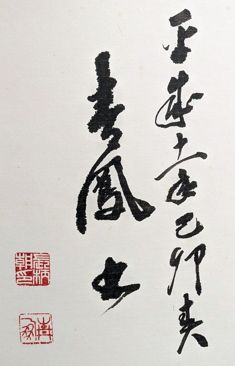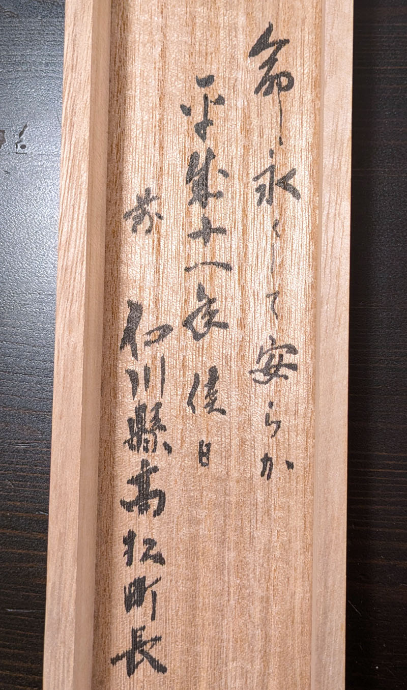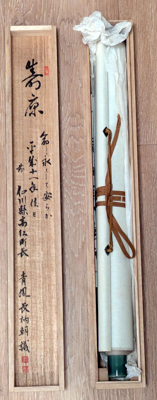 Laut der Auktionsbeschreibung scheint es ein Werk von Nagara Asa 長柄朝 zu sein, der zwischen 1982 und 1990 Bürgermeister von Takamatsu-chō in der Präfektur Ishikawa war.