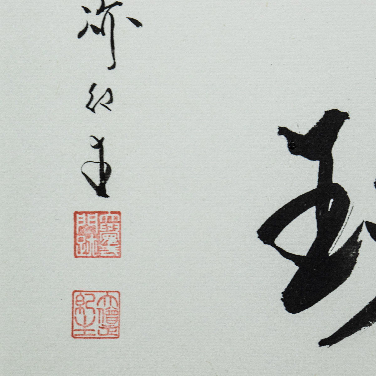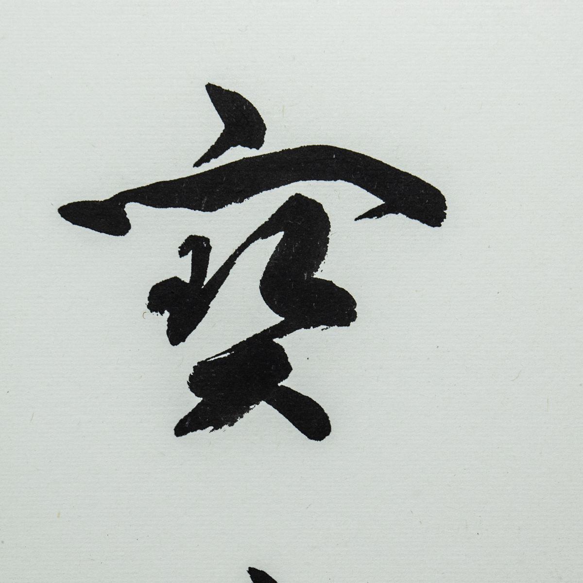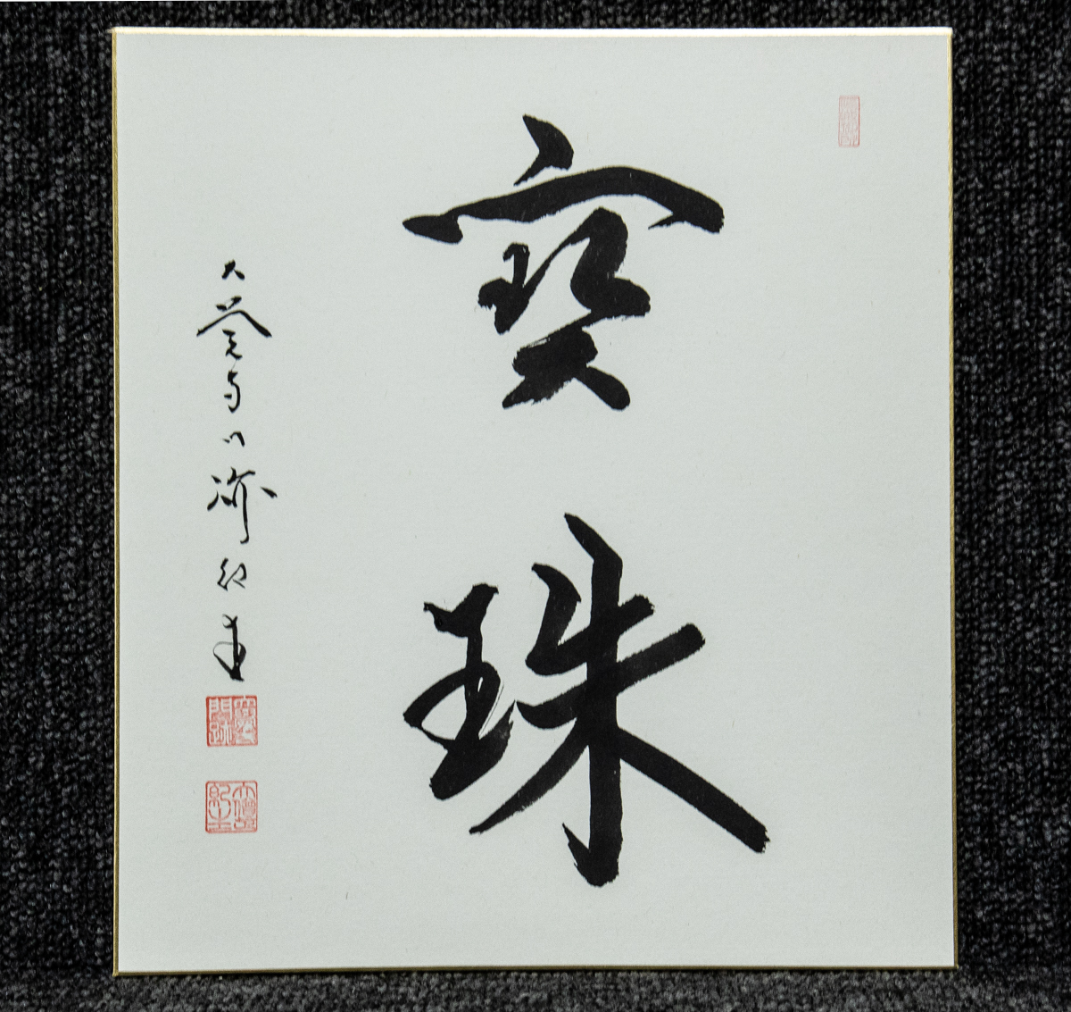 Auf diesem Shikishi sind die Kanji 宝珠 zu sehen, die "Juwel" oder "Kostbare Perle" bedeuten 宝 takar(a) / hō = Schatz, Kostbarkeit 珠 shu / tama = Perle, Edelstein Auf einem Shikishi (traditionelle japanische Kalligraphietafel) steht 宝珠 üblicherweise für eines der folgenden Konzepte: Buddhistisches Symbol: Die Nyoi-hōju 如意宝珠, ein mythischer Juwel, der Weisheit, Erkenntnis oder Wunscherfüllung symbolisiert. Glücks- und Segenswunsch: Wird oft als motivierende oder positive Botschaft geschrieben. Ästhetisches Motiv: Ein klassisches, wohlklingendes Zweizeichenwort, häufig für Übungs- oder Demonstrationskalligraphie verwendet, da es klare, ausdrucksstarke Strichführung erlaubt.