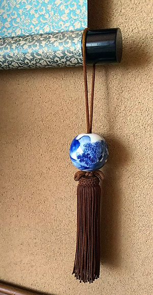 軸先 Jikusaki Die dekorativen Teile an beiden Seiten der Rolle werden Jikusaki (Jiku-Spitze) genannt. Sie halten diese Teile beim Rollen einer Hängerolle fest. |