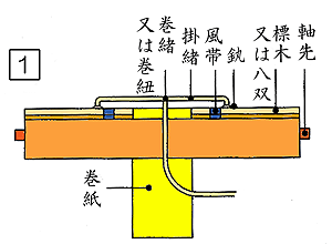 軸棒 Jikubo (Stab) Der Holzstab, der an der Unterseite einer Hängerolle befestigt ist und beim Aufrollen als Kern dient, wird Jikubo genannt. Beim Zusammenbau der Rolle wird dieser Stab um die oberen und unteren Stoffe sowie das Washi-Papier gewickelt, wodurch er unsichtbar wird. |
