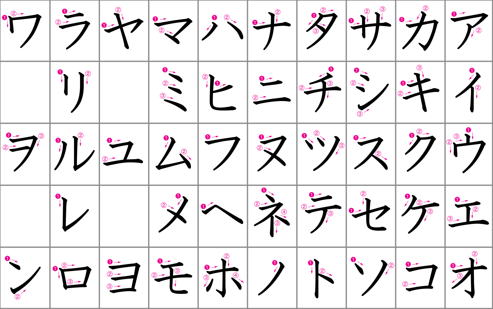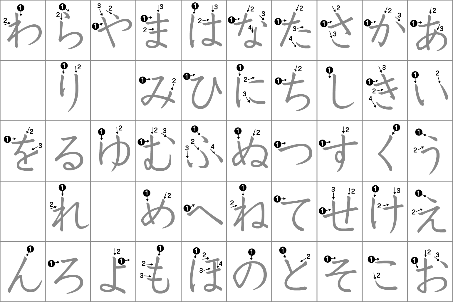 Im Japanischen gibt es im Gegensatz zu vielen anderen asiatischen Sprachen keinerlei "Töne", und es gibt nur zwei Ausnahmen im Alphabet, die später erklärt werden. Das japanische Alphabet besteht nicht aus Buchstaben, sondern aus Zeichen, und technisch gesehen handelt es sich nicht um ein Alphabet, sondern um einen Zeichensatz. Die Zeichen in der folgenden Tabelle heißen Hiragana. Hiragana ist das Hauptalphabet bzw. der Hauptzeichensatz des Japanischen.