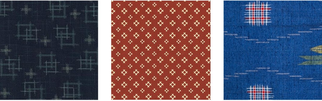 Komon hauptsächlich auf Kimonostoffen, wobei sowohl große als auch kleine Muster zum Einsatz kommen.