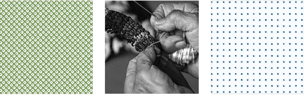 Shibori ist eine Abbindetechnik, ähnlich dem Batikfärben, bei der Stoff mit Schnur abgebunden wird, um kunstvolle Muster zu erzeugen. Nach dem Entfernen der Schnur kommen detaillierte Bilder zum Vorschein. Shibori-Färben erfordert viel Zeit und Geschick. Die oben gezeigten kleinen Punktmuster sind als Kanoko Shibori bekannt.