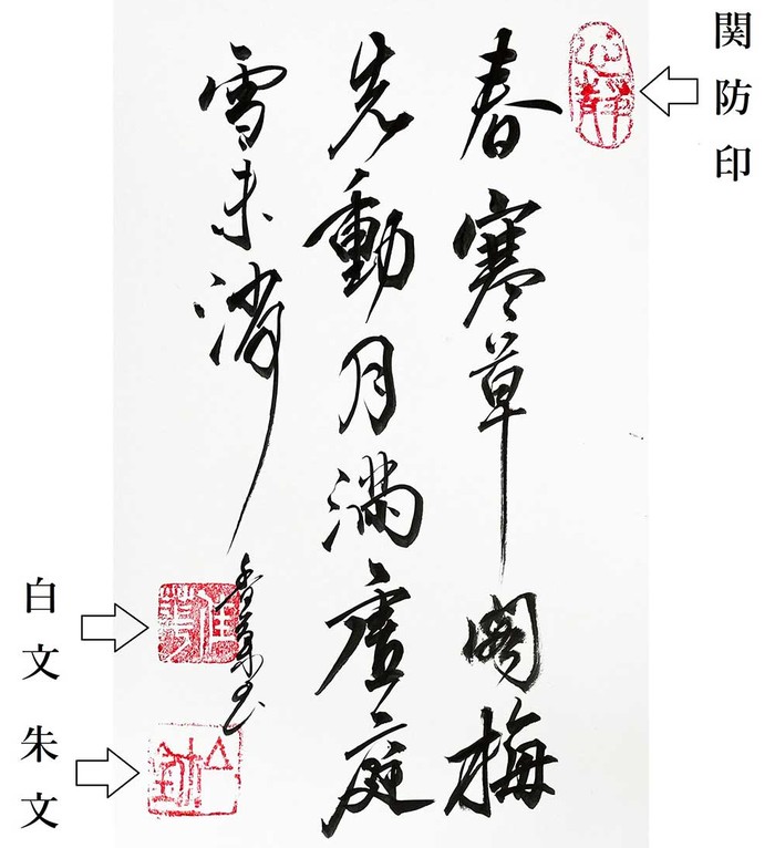 Es gibt auch andere Siegel, wie das 関防印, das oben rechts auf dem Werk angebracht wird, oder das 遊印, das als dekoratives Element des Werkes verwendet wird.
